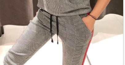 Disse komfortable elastikbukser – også kaldet joggerbukser – har et elegant ternet mønster og en rød sidestribe, der giver et moderne twist. Med elastisk linning, justerbar snøre og praktiske sidelommer er de både funktionelle og flatterende.