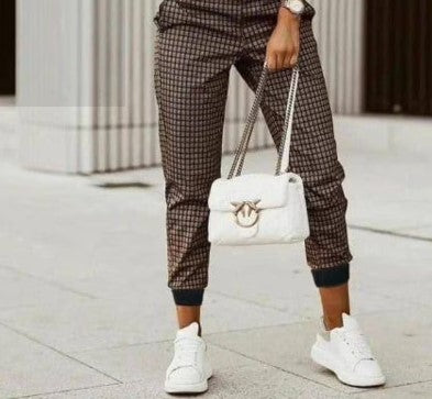 Bukserne har samme elegante tern som trøjen, og sidder til på den helt rigtige måde: tætsiddende, men behagelige – takket være den elastiske linning og smalle ben med sorte ribkanter.